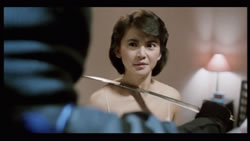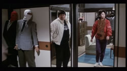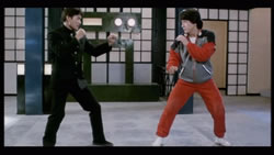 The main content of the film can be split into the distinct spheres of action and comedy, with Jackie and Sammo providing the lion's share of the action and the Lucky Stars (Sammo included) providing the latter. The film begins with the almost obligatory car chase and some great martial arts sequences. Action highlights during My Lucky Stars include Yuen Biao doing a backwards somersault over a ninja and Jackie Chan redoing his Drunken Master stunt where a flying blade cuts some of his hair off. Sammo Hung also manages to look resplendent sporting a Bruce Lee inspired yellow costume. For a bit of trivia, this one of only a few movies I have seen Jackie shoot and kill several bad guys. To see Jackie with a gun is not exceptional (Police Story, Crime Story, Heart of Dragon etc) but he very rarely actually shoots people dead. The final fight is the strongest point of the movie with Sammo, Jackie and Yuen Biao squaring up against Lau Kar Wing, Dick Wei and Lam Ching Ying respectively! As might be expected, there are several hapeless stuntmen falling through glass tables (see the outtakes!) and dropping 20ft but this action is a triumph for the timing and power of the main protagonists more than anything else. However, it would be unfair to overlook the team which worked alongside stars. Significant contributions to My Lucky Stars came from Yuen Wah, Lau Kar Wing, Dick Wei, Chin Kar Lok and Lam Ching Ying among others. Yuen Biao and Lam Ching Ying richly deserved their nomination for their action choreography at the Hong Kong Film Awards. The comedy is less successful than the finely tuned action but it does prevent the film moving along at a pleasant pace between the showcase martial arts sequences. The significant comedy revolves around the Lucky Stars and Inspector Woo residing in the same building. After a diarrhoea gag involving a shortage of toilets, the lengthiest joke revolves around a bunch of ninjas tying up Inspector Woo with one of the Lucky Stars whilst they rob the house. As luck may have it, all of the Lucky Stars get the opportunity to be 'tied up' with Inspector Woo! This comedy it at the early beginnings of a rich tradition of 'goofy' Hong Kong comedy, including a gullible lead lady and several sex obsessed blokes. Many have labelled Jackie synonymous with this form of comedy, but have overlooked Sammo's indulgence in similar frolics. Sammo, and his Lucky Stars enjoy most of the 'goofy' comedy in this movie and Jackie for the most part plays a straight laced cop. The comedy is not up to the standard of Wheels and Meals in the previous year, but as could be expected, Richard Ng and Eric Tsang provide most of the biggest laughs. |