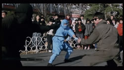 One thing that all the Lucky Stars films have in common is the general lack of plot beyond some vague motivations and locations. These serve as vehicles for the jaw-dropping action scenes and the trademark comedy. The basic premise of this film is that Jackie Chan (Muscles) and Yuen Biao (Ricky) are chasing a bent cop (Lam Ching Ying) who has some stolen gems in Japan . After a pursuit into a fairground, Jackie and Yuen Biao are accosted by a handful of brightly coloured ninjas in broad daylight (surely a comedic homage to Chang Cheh!?), and Yuen Biao is taken hostage! There is no other option that to rely on old friend Kidstuff (Sammo Hung) to get out of this situation. Sammo reforms his Lucky Stars; Richard Ng, Charlie Chin, Stanley Fung and Eric Tsang (replacing John Shum). These unlikely chaps are reluctant to help out until they realise that they will be working with the gorgeous Inspector Woo (Sibelle Hu). The final encounters leads the Lucky Stars back to the fairground where they find the bent copper and Ricky, but as you may have guessed it's never that easy! |